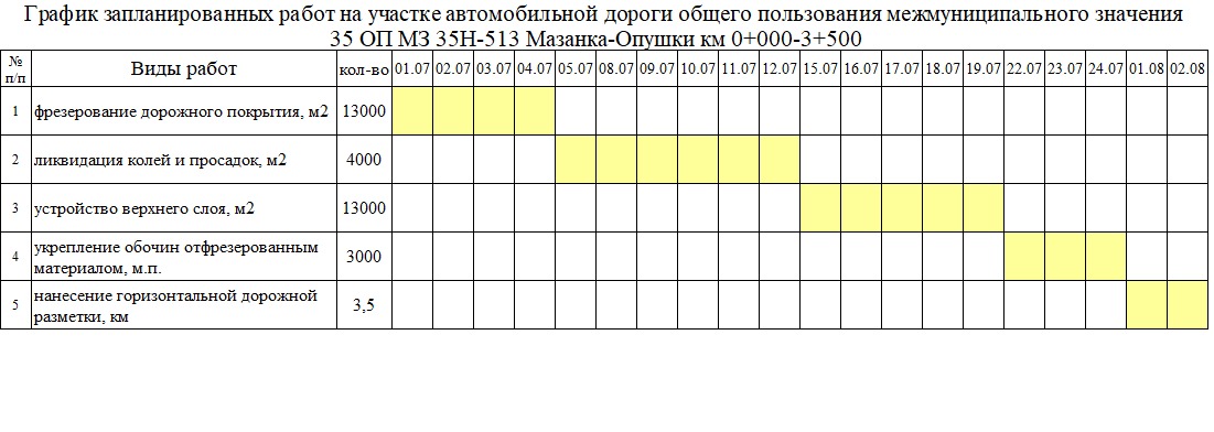 С начала июля дорожники отфрезеруют 13 000 м2 верхнего слоя асфальтобетона, проведут ликвидацию колей и просадок общей площадью 4000 м2, после чего будет уложен верхний слой дорожной одежды общей площадью 13000м2 и проведено укрепление обочин. По завершении работ на участке ремонта будет нанесена разметка протяженностью 3,5 км.