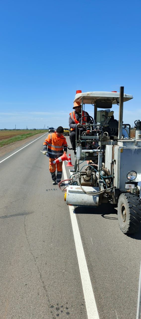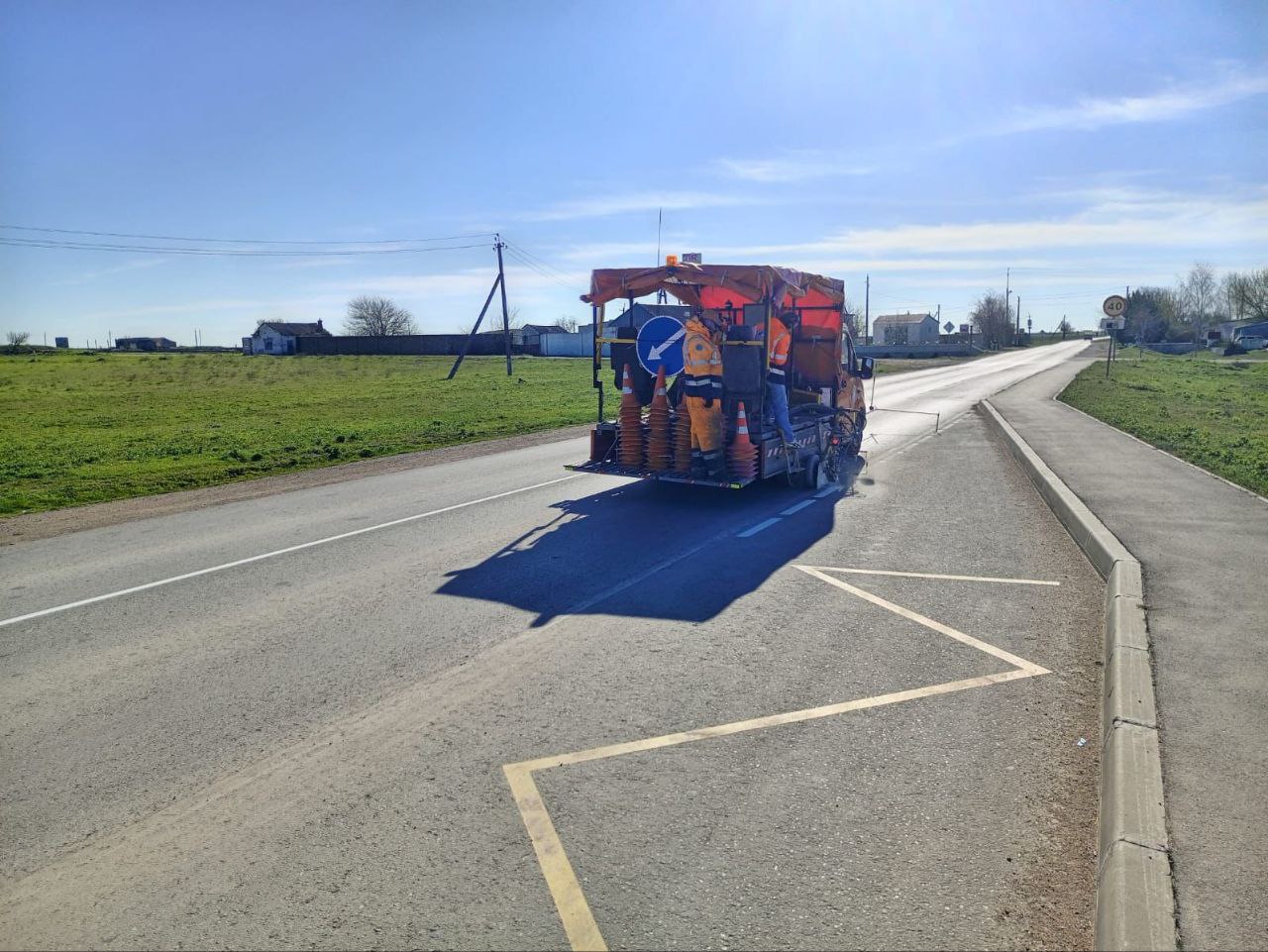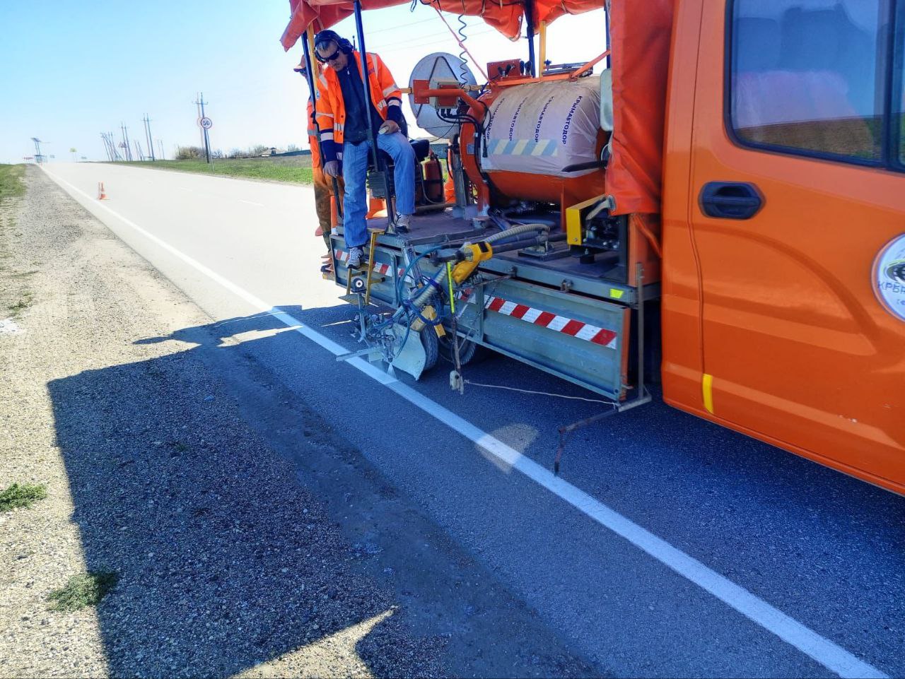 – а/д Саки — Митяево — термопластик. Нанесли его горячим, он быстро застывает, создавая чёткую линию, которая долго будет держаться.