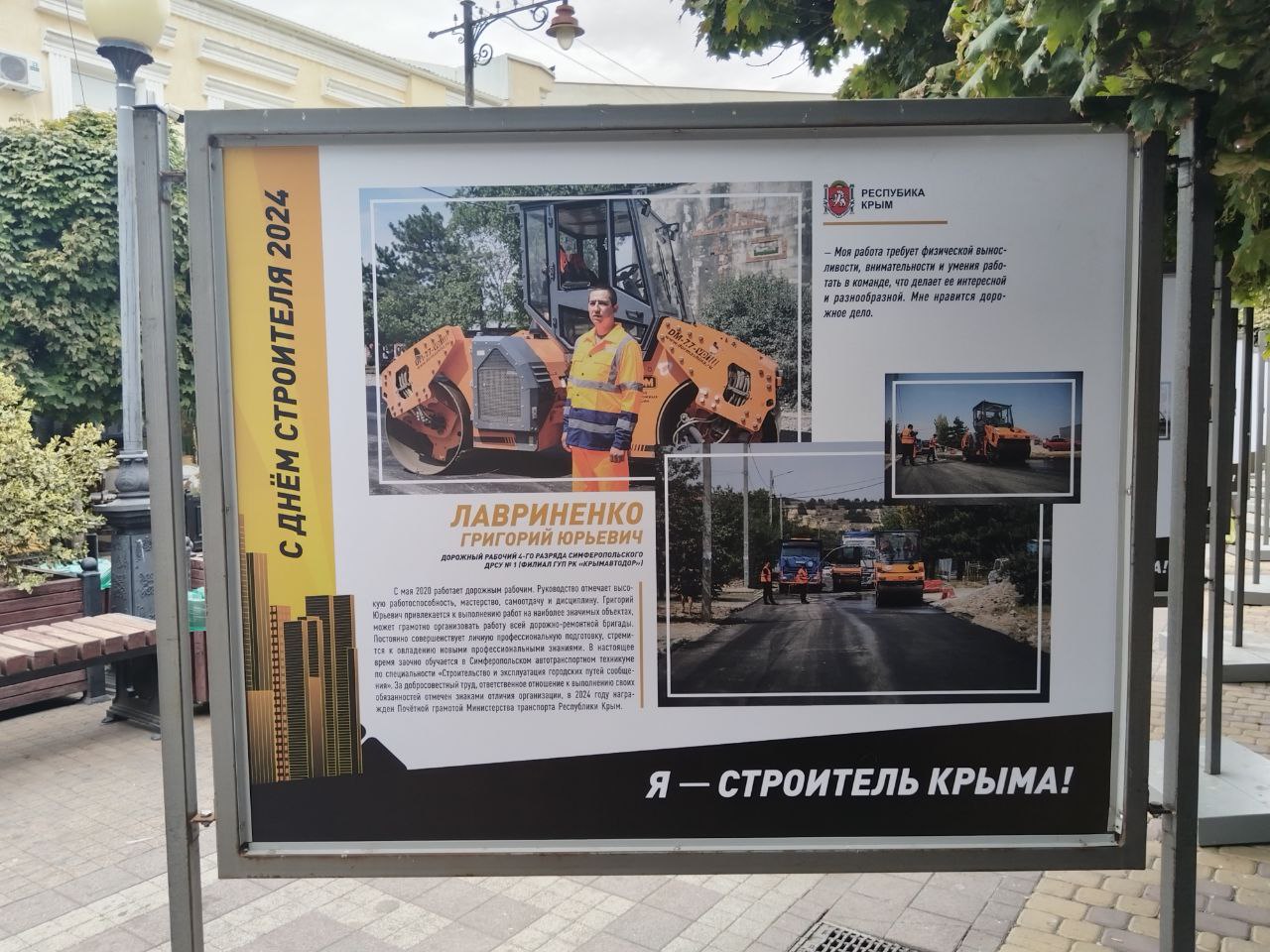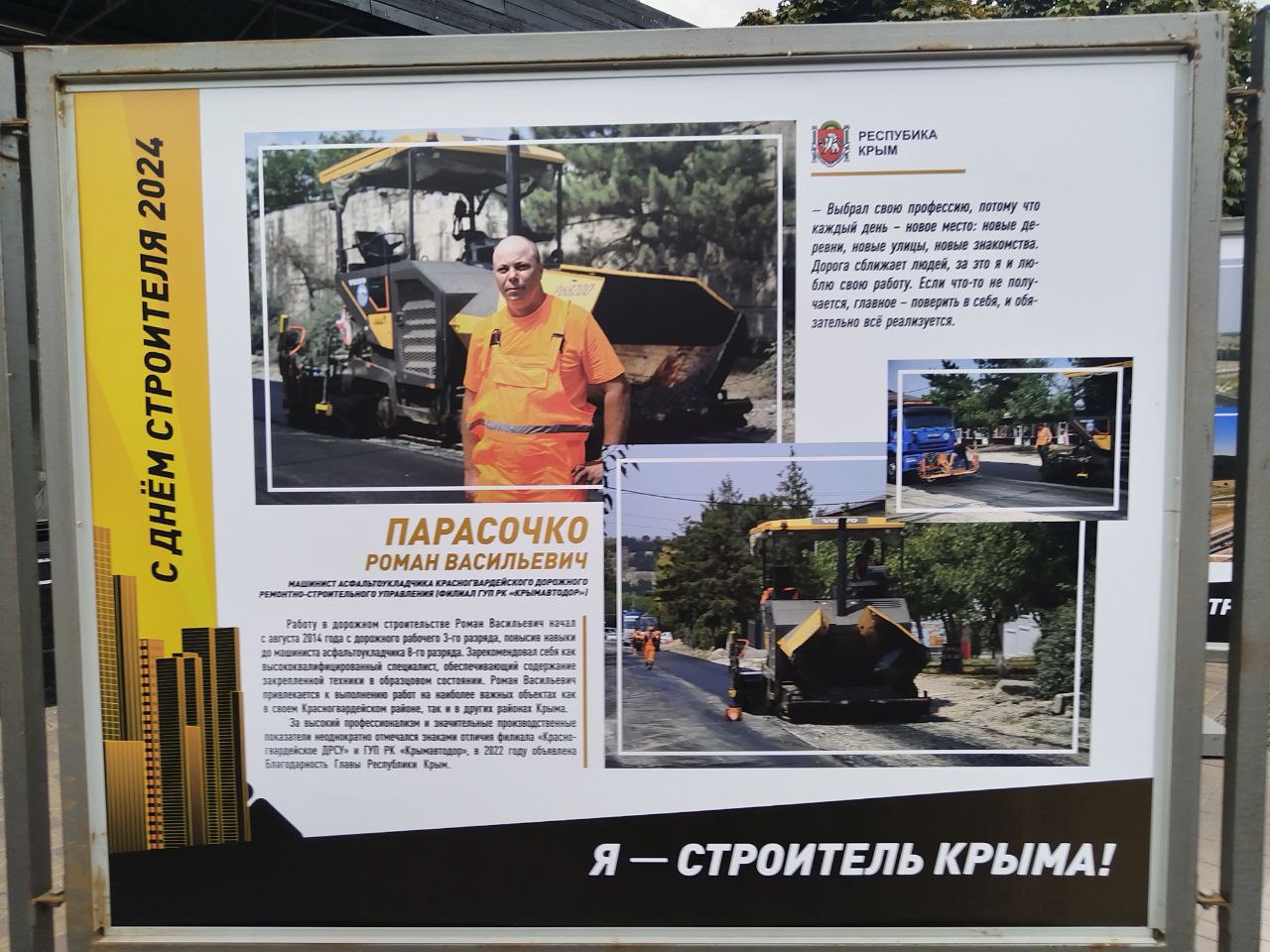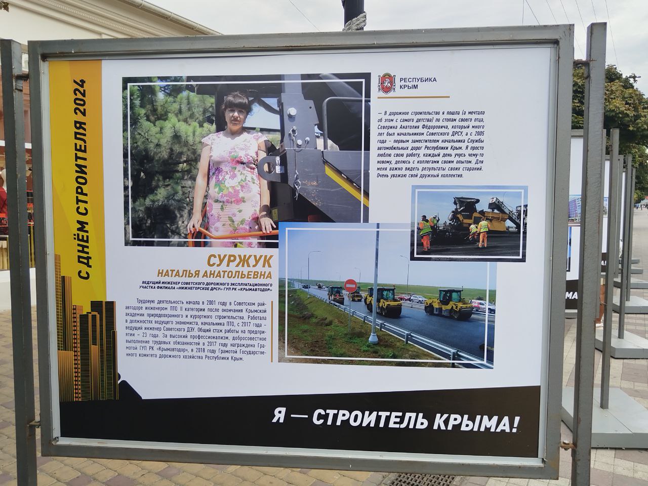 Среди участников достойное место заняли и наши дорожники, которые внесли вклад в развитие транспортной инфраструктуры полуострова. Присутствие дорожников на выставке ещё раз подтверждает их важную роль в развитии полуострова. Фотовыставка "Я - строитель Крыма" даёт возможность каждому посетителю увидеть и почувствовать, как много сил и энергии вкладывают эти люди в развитие нашей республики. Каждый представленный герой — это пример профессионализма и преданности своему делу, благодаря которым Крым становится удобным и безопасным для жизни и путешествий.